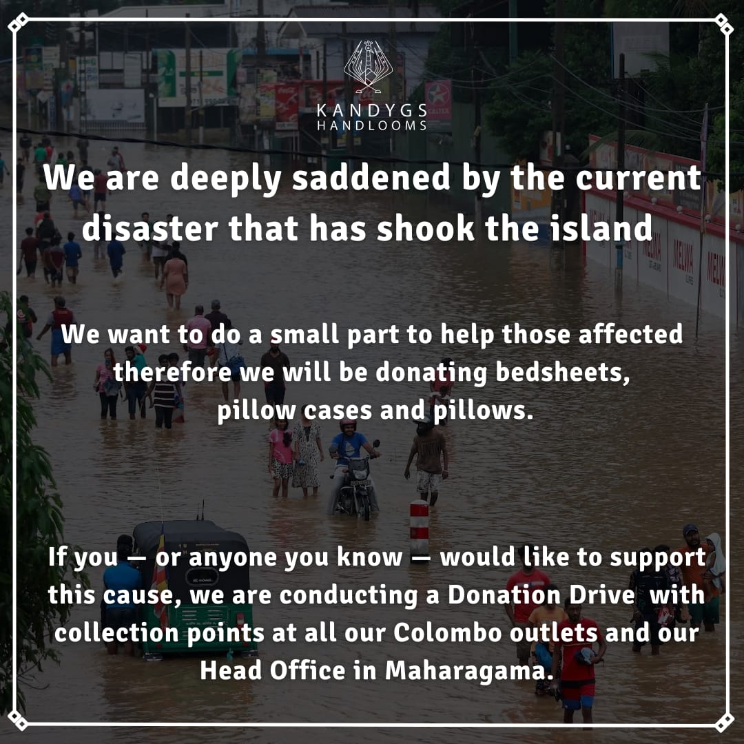 Kandygs Handlooms is supporting affected families by donating bedsheets, pillow cases and pillows. You can join our Donation Drive by dropping off essential items at any of our Colombo outlets or our Head Office in Maharagama.